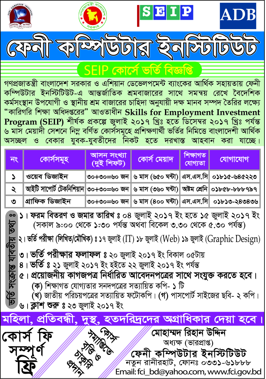 গণপ্রজাতন্ত্রী বাংলাদেশ সরকার ও এশিয়ান ডেভেলপমেন্ট ব্যাংকের আর্থিক সহায়তায় ফেনী কম্পিউটার ইনস্টিটিউট-এ আন্তর্জাতিক শ্রমবাজারের সাথে সমন্বয় রেখে বৈদেশিক কর্মসংস্থান উপযোগী ও স্থানীয় শ্রম বাজারের চাহিদা অনুযায়ী দক্ষ মানব সম্পদ তৈরির লক্ষ্যে “কারিগরি শিক্ষা অধিদপ্তরের” আওতাধীন Skills for Employment Investment Program (SEIP) শীর্ষক প্রকল্পে জুলাই ২০১৭ খ্রিঃ হতে ডিসেম্বর ২০১৭ খ্রিঃ পর্যন্ত ৬ মাস মেয়াদী সেশনে নিন্ম বর্ণিত কোর্সসমূহে প্রশিক্ষণার্থী ভর্তির নিমিত্তে বাংলাদেশী আর্থিক অসচ্ছল ও বেকার যুবক-যুবতীদের নিকট হতে দরখাস্ত আহবান করা যাচ্ছে।