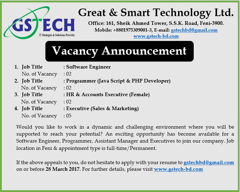 ফেনীর সর্ববৃহৎ ও সর্বপ্রথম সফটওয়্যার নির্মাতা প্রতিষ্ঠান “গ্রেট এন্ড স্মার্ট টেকনলোজী লিঃ” এর জন্য দুইজন প্রশিক্ষক, দুইজন (মহিলা) HR & Accounts Executive, দুইজন ডেভলপার (WordPress & PHP), দুইজন প্রোগ্রামার (Java) নিয়োগ দেয়া হবে । এছাড়া মার্কেটিং বিভাগের জন্য ৫ জন লোক নিয়োগ করা হবে। আগ্রহীদের আগামী ২৮ তারিখের মধ্যে প্রয়োজনীয় কাগজপত্রসহ আবেদন করার অনুরোধ করা গেল।