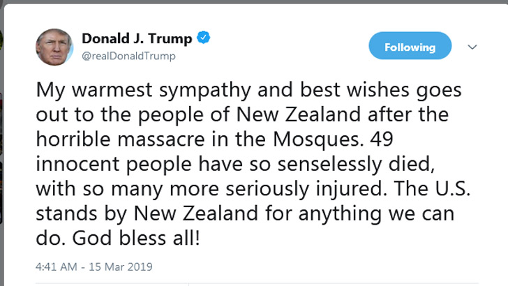 নিউজিল্যান্ডের মসজিদে বন্দুকধারীর হামলার পর ডোনাল্ড ট্রাম্প টুইটার বার্তায় বলেন, ‘মসজিদের ভেতর এই জঘন্য হত্যাকাণ্ডের পর নিউজিল্যান্ডের জনগণকে আমার সবচেয়ে গভীর সমবেদনা এবং শুভকামনা।