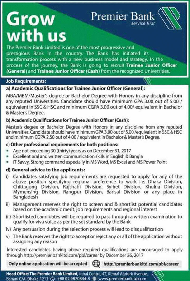 ট্রেইনি জুনিয়র অফিসার (ক্যাশ) পদে নিয়োগের জন্য বিজ্ঞপ্তি প্রকাশ করেছে প্রিমিয়ার ব্যাংক। পদটিতে নারী ও পুরুষ উভয়েই আবেদন করতে পারবেন।