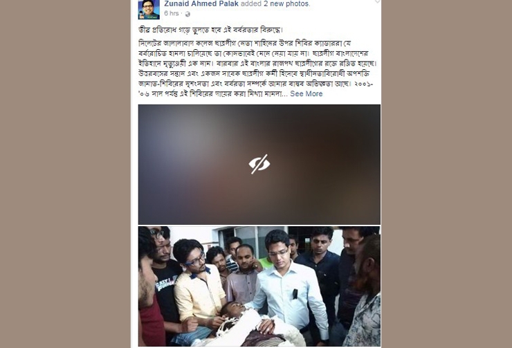 সিলেটের জালালাবাদ কলেজ ছাত্রলীগ নেতা শাহিনের ওপর শিবিরের হামলার নিন্দা জানিয়ে ফেসবুকে পোস্টে আইসিটি প্রতিমন্ত্রী জুনাইদ আহমেদ পলক শিবির প্রতিরোধের আহ্বান জানিয়েছেন।